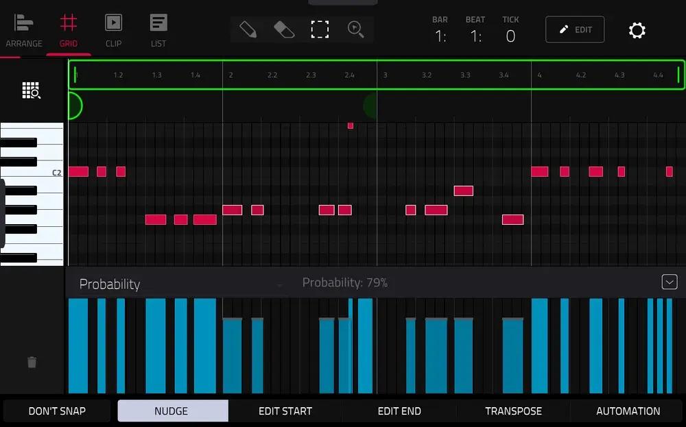 In FORCE 3.2 you can now add Ratchet effects to your MIDI and add groove to rhythmic elements or melodic lines. Flare cymbals, trill synth lines or repeat bass notes with the flick of a finger. The Probability MIDI setting lets you choose the probability that a note from your MIDI track will play based on 0% to 100% probability—perfect for adding some variation and dimension to your repetitive beats, rhythm, or melody lines.