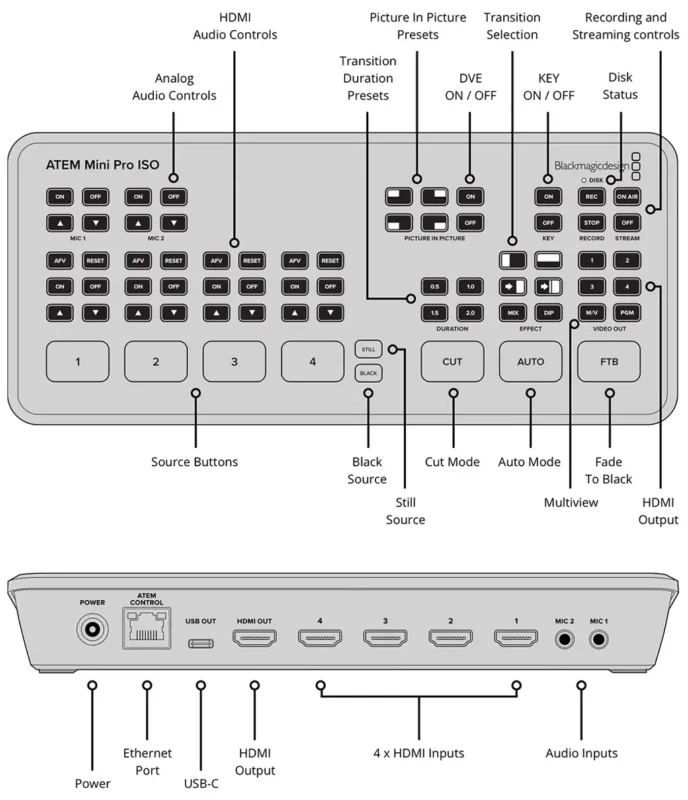 The ATEM Mini Pro ISO HDMI Live Stream Switcher from Blackmagic Design is a compact, feature-rich solution designed for professional multicamera live streaming and video production. With four HDMI inputs and an integrated control panel, it supports live streaming up to 1080p HD directly to the internet via Ethernet. One of its standout features is the ability to record the program output as well as individual HDMI inputs simultaneously to an external USB drive (not included), making it ideal for post-production adjustments and edits.