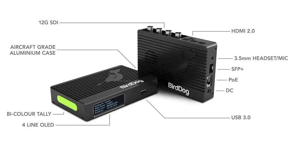 Based on BirdDog’s custom NDI silicon chip, the BirdDog 4K 12G-SDI NDI Encoder/Decoder supports up to UHD 4K/60 video input for distribution on NDI networks in full-bandwidth I-frame compression. The compact device is housed in an aircraft-grade aluminium case and features a 12G-SDI input and 12G-SDI and HDMI 2.0 individual outputs. It also has a built-in cross converter that allows the SDI input to be looped out via the HDMI output.