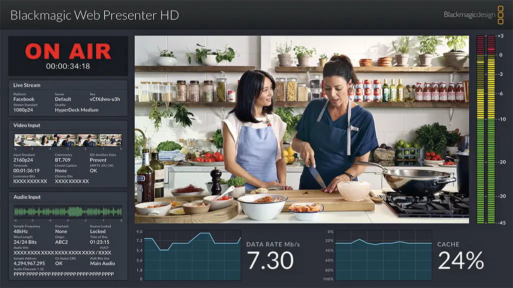 Traditional broadcast transmitters are critical equipment in a television station, however now the streaming server is just as critical because millions of viewers can be watching globally! To help, Blackmagic Web Presenter includes a feature rich technical monitoring output. The graphics based monitoring output includes a video view, audio meters with accurate ballistics, trend graphs for codec data rates and cache fill, plus a summary of the streaming settings and detailed SDI technical information. Plus the technical monitoring output works in full 1080 HD and outputs to both SDI and HDMI. That means you can use an SDI router for monitoring multiple units, or connect a simple HDMI TV!