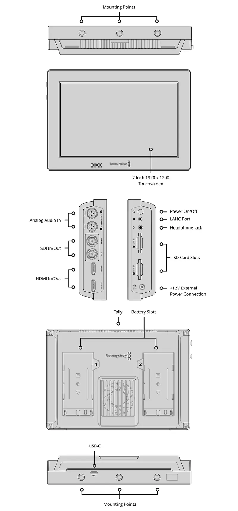 SDI Video Inputs SDI Video Outputs SDI Rates HDMI Video Inputs HDMI Video Outputs Analog Audio Inputs Analog Audio Outputs Built in Speaker Screen Dimensions Screen Brightness SDI Audio Inputs SDI Audio Outputs HDMI Audio Inputs HDMI Audio Outputs Remote Control SD Interface Storage Type Computer Interface |