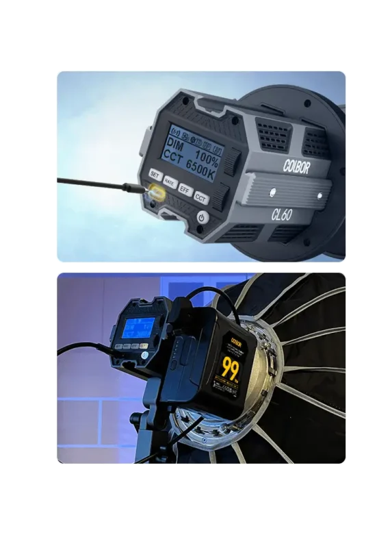 With the integration of Matrix Control System, each CL60 studio light for video can act as a controller to the other light. This is important when more lights is “PowerCube” together as an inbuilt Light Neural Networks (referred to as LNNs), you can adjust the same brightness and color temperature for 10 lights together at the same time. A 2-inch super wide LED screen provides intuitive display.