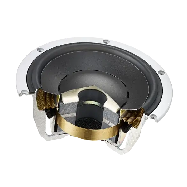 Large diameter voice coil surrounds the magnet for superior linearity. Aluminum voice coil former and wire are low mass so transient response is quick and accurate. Diaphragm and dust cap are moulded as one piece in patented low-mass, highly rigid Magnesium Silicate Polymer providing unrivaled accuracy.