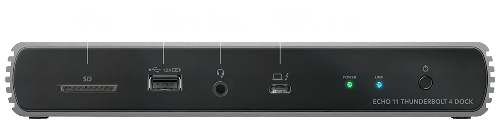 Echo 11 Dock features four Thunderbolt 4 ports; one for connection/power to your computer, plus three to connect Thunderbolt peripheral devices. The Thunderbolt ports also support USB4 and USB 3 peripherals. For connected peripherals using bus power, the dock’s Thunderbolt peripheral ports provide 15W each, supporting even the most demanding bus-powered Thunderbolt and USB peripherals.