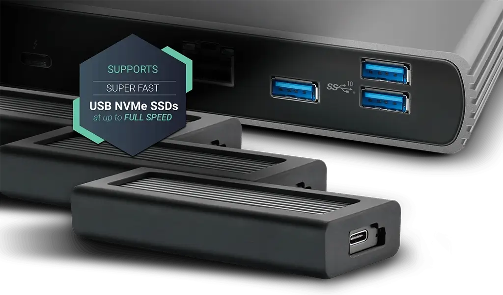 Echo 11 Thunderbolt 4 Dock features three USB 3.2 Gen 2 (10Gbps) Type A ports on the back to support super fast USB NVMe SSDs at up to full speed. And unlike some other docks, Echo 11 doesn’t skimp on power either — each port provides up to 7.5W, ensuring bus-powered devices will operate without fail.