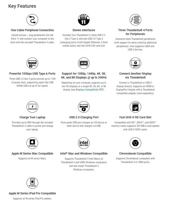 Echo 11 Thunderbolt 4 Dock is certified for use with Apple M series Macs; Thunderbolt 3 Intel Macs; Thunderbolt 4 and USB4 Windows computers; Thunderbolt 3 Windows computers with an Intel 8th Gen (2018) or newer CPU; Thunderbolt 4 and USB4 Chromebook computers; and M series iPad Pro. See Tech Specs for current computer and OS compatibility information.