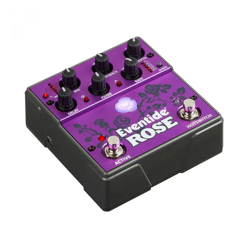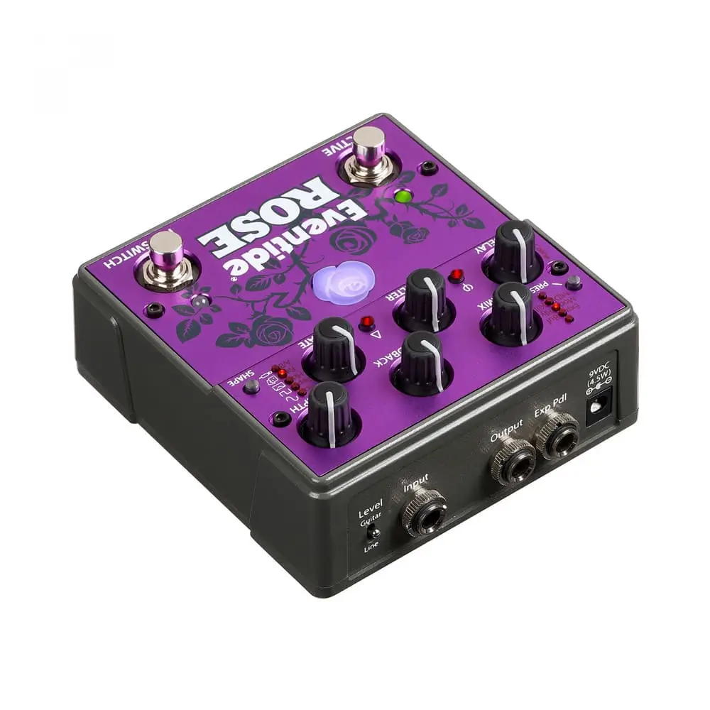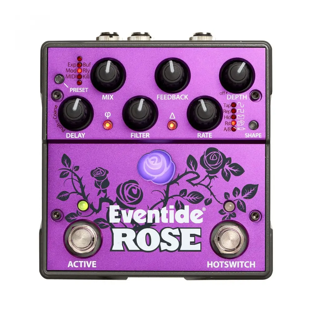 From reverse delays, slapback, chorus, and everything in between, Rose is capable of producing a wide range of sounds. The perfect hybrid of analog and digital, the pedal features five different modulation sources, delay multiplier, phase invert/reverse, 25 customizable presets, true analog dry path, MIDI, and AUX/Expression via TRS for ultimate versatility, on stage or in the studio.