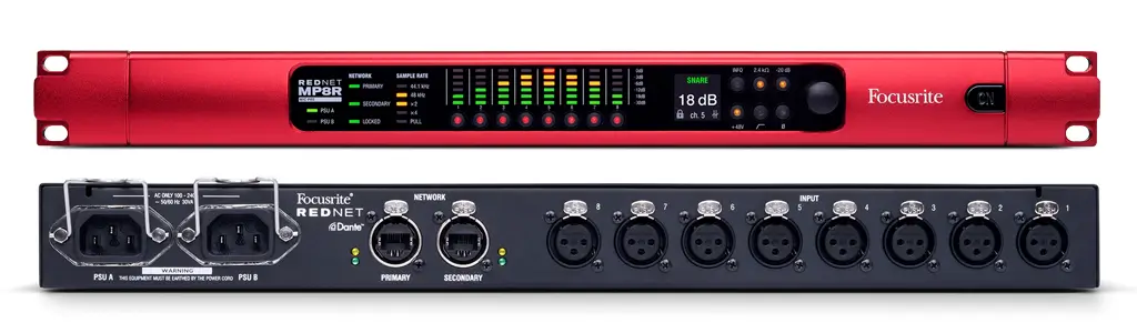 RedNet MP8R is a 1U, eight-channel remote-controlled mic pre and A-D interface for any Danteâ„¢ audio-over-IP network. Featuring network and power supply redundancy, RedNet MP8R is the ideal choice for providing mic pres in many critical-path applications, whether in Post Production, Broadcast, Live Sound or the Recording Studio.