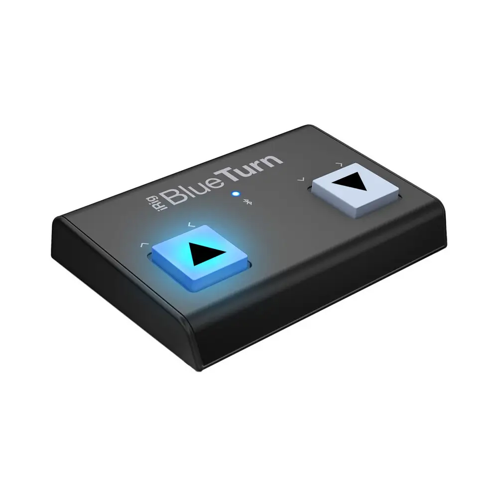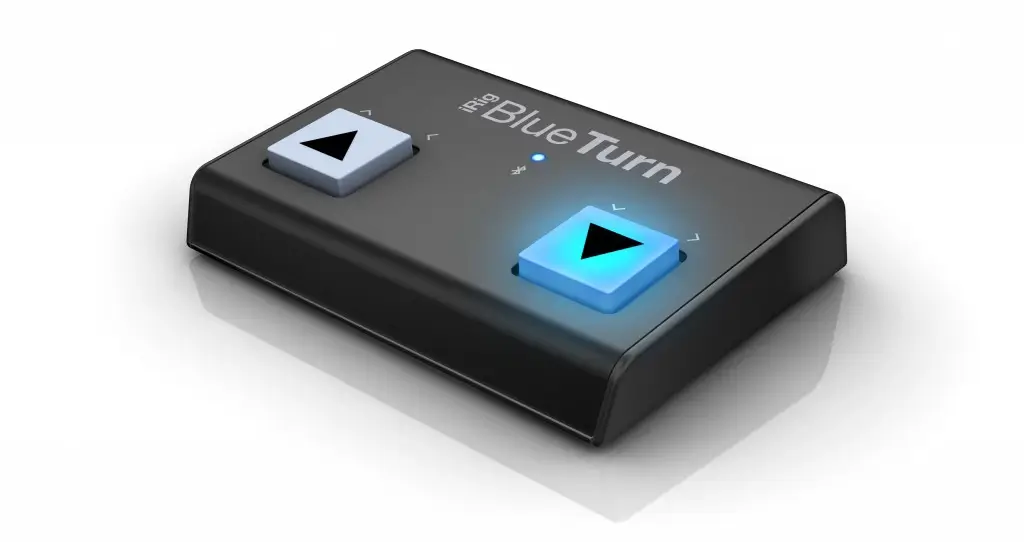 iRig BlueTurn lets you take control from the floor with ease. Its two noiseless buttons send HID messages to a synced device via Bluetooth LE technology.