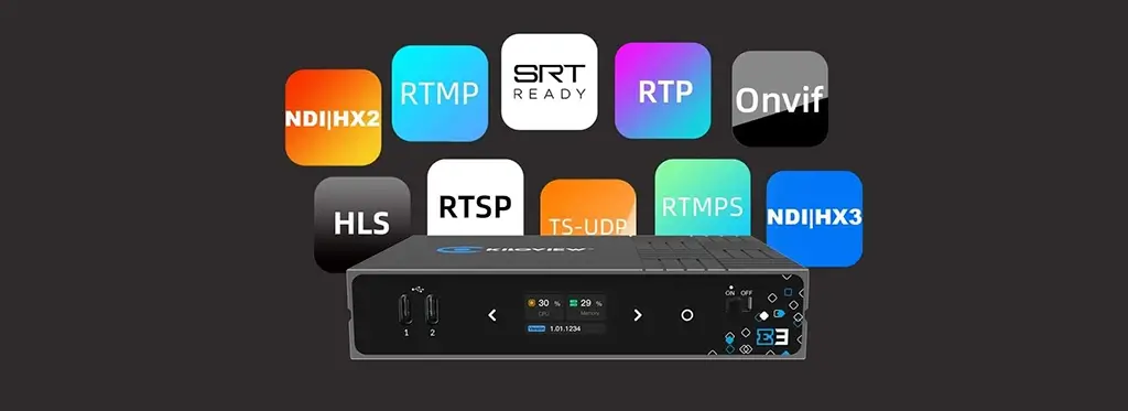 For broad applications, E3 supports a complete range of streaming protocols including NDI HX3/NDI HX2/SRT/RTMP/RTMPS/HLS/TS over UDP/RTP*/RTSP/Onvif*. It can be used for live production with NDI HX, remote production with SRT, live streaming with RTMP or HLS, or any transmission with all different protocols.