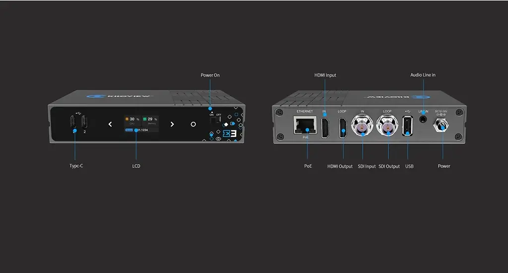 The E3 input can be up to 4Kp30 from its HDMI port and up to 1080p60 from its 3G-SDI port. With its powerful output capabilities, E3 can go live to up to 4 different platforms simultaneously, max bitrate can be up to 120Mbps.