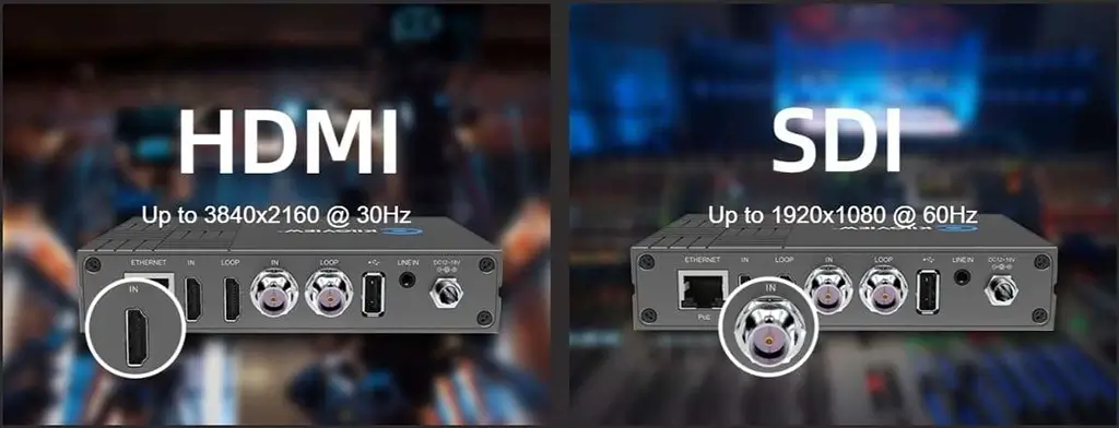 *Note: Resolution for simultaneous encoding is up to 1080p60 for both 3G-SDI and HDMI. If resolution of HDMI is 4Kp30, then the video will be either down-scaled to 1080P60 for simultaneous encoding, or selected either 3G-SDI or HDMI or a mix video with PIP or PBP layout.