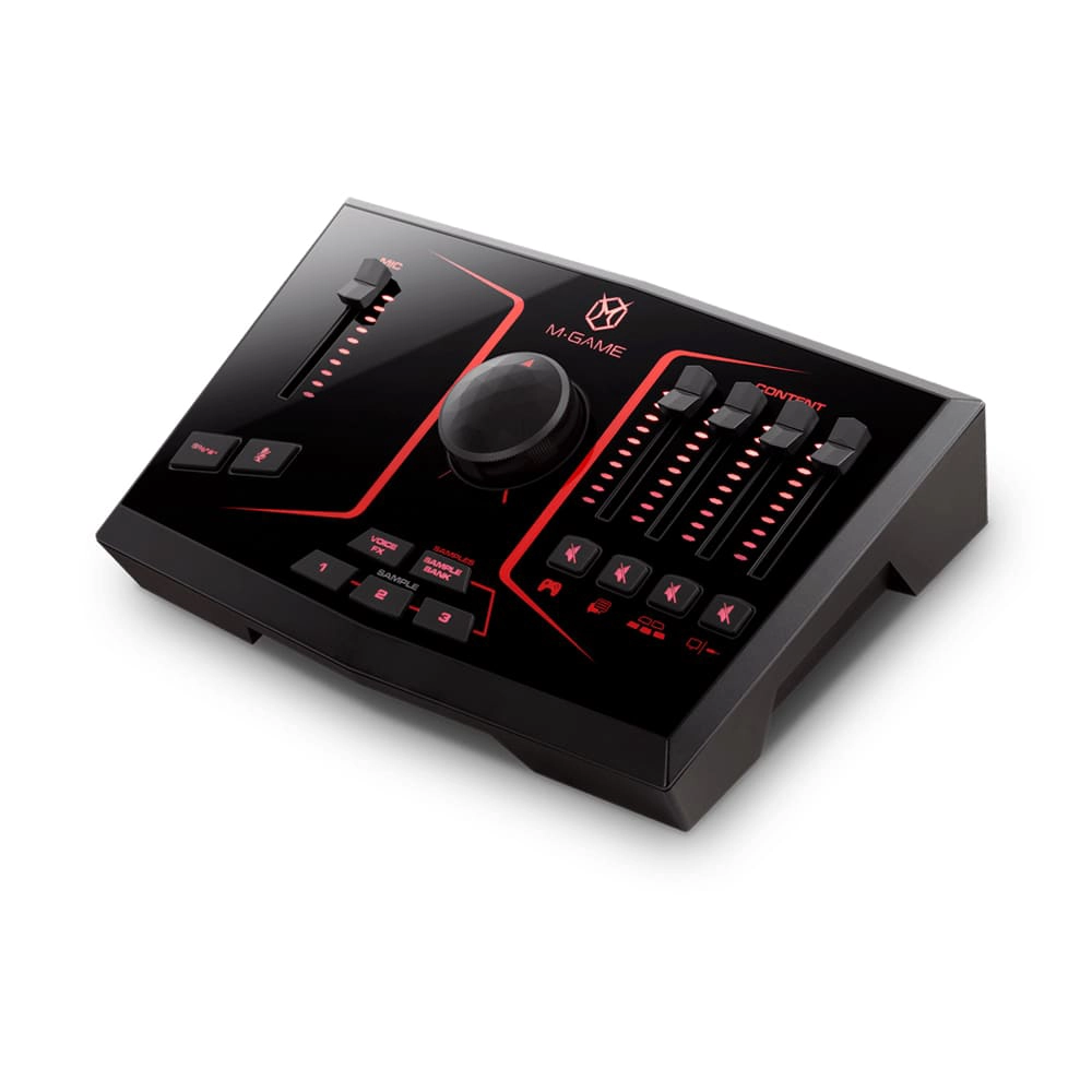 USB streaming audio interface/mixer with LED lighting, sampler, and voice shaping and effects combined with a professional audio interface and physical mixing control surface.