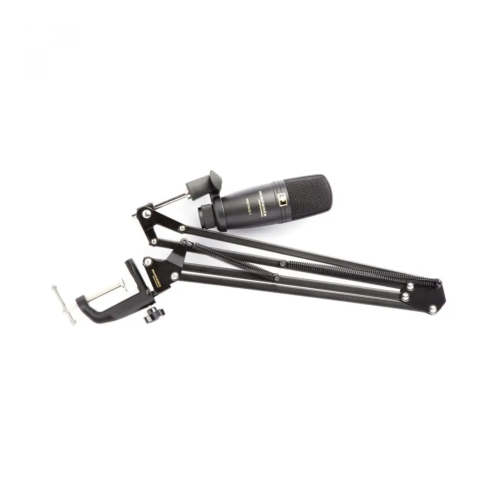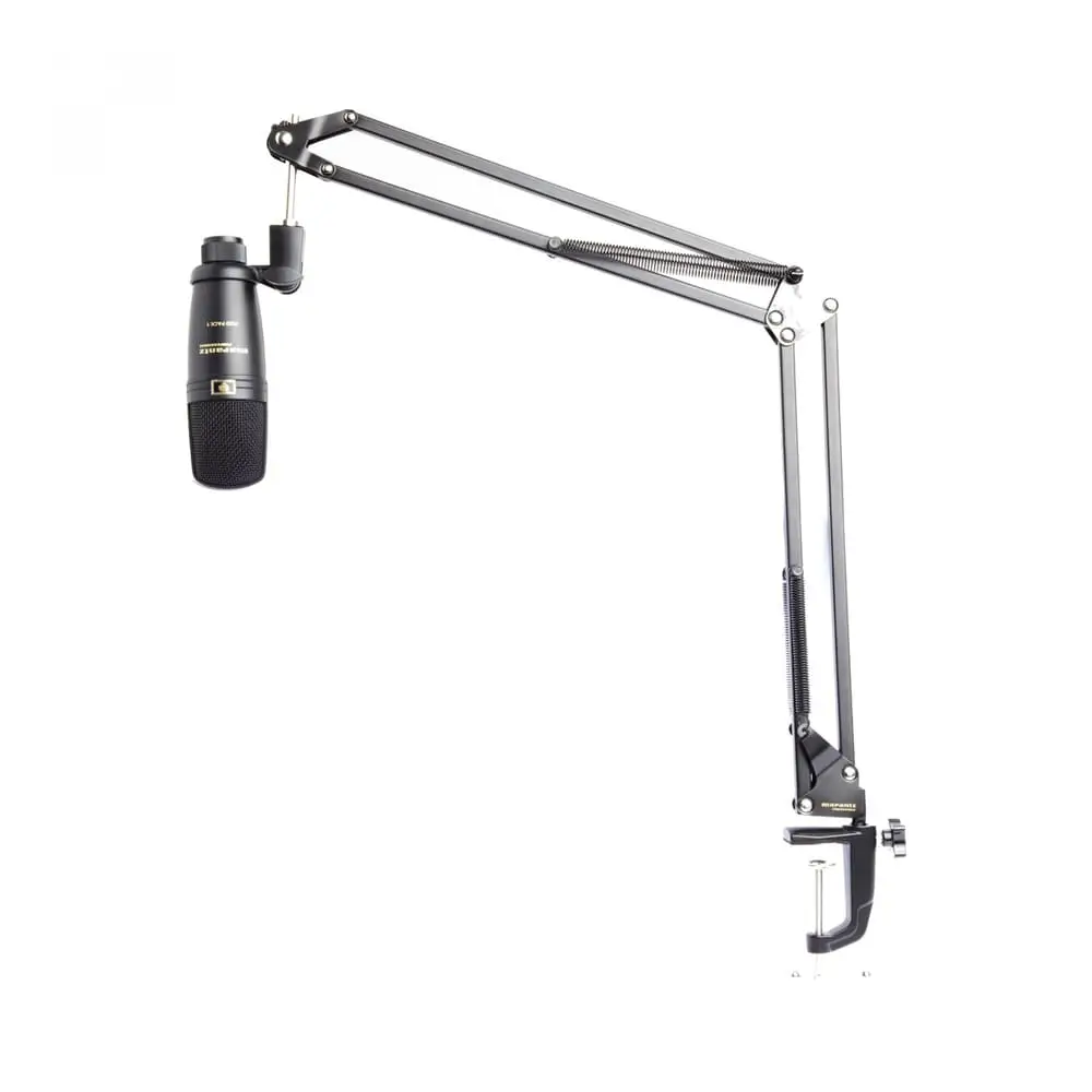Articulating boom arm clamps to virtually any desk or table and dual suspension springs provide stability at any angle – the microphone can even be suspended upside down
