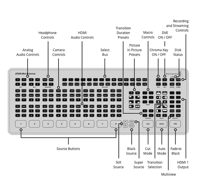 The front panel includes easy-to-use buttons for selecting sources, video effects, and transitions. The source buttons are large, allowing you to operate them by feel. Included on the ATEM Extreme are buttons for audio mixing, recording, and streaming control, as well as output selection buttons that let you change the video output between cameras, program, and multiview. On the rear panel, there are HDMI connections for cameras or computers, extra microphone inputs, USB for webcam out, plus an HDMI "AUX" output for program video.