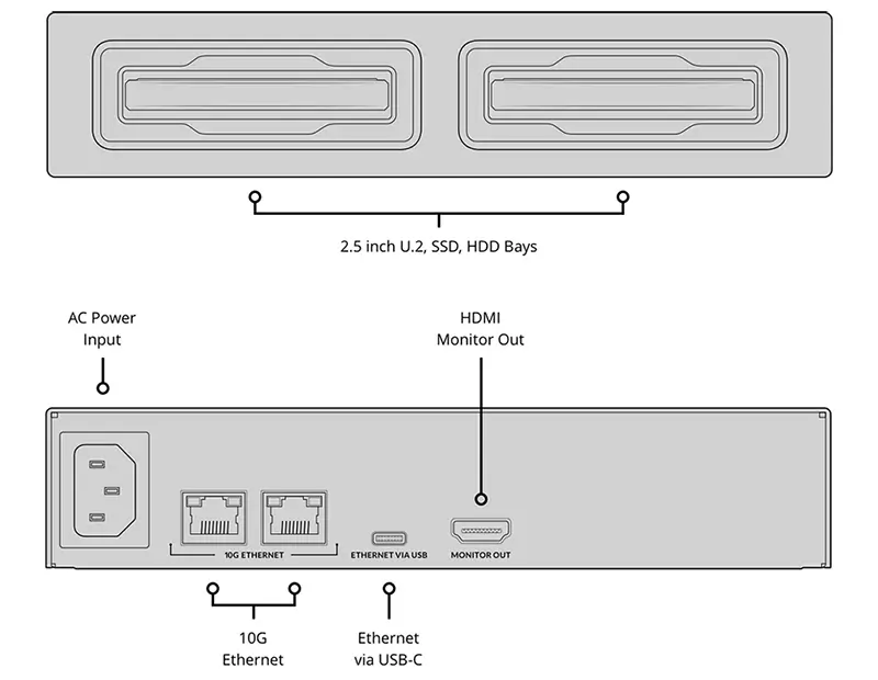 SSD Interface 10G Ethernet Ports USB-C Port HDMI Monitor Outputs Computer Interface |