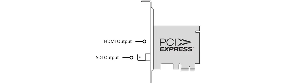 | Connections | SDI Video Output 1 x 10-bit SD/HD switchable SDI Rates 270Mb, 1.5G, 3G SDI Audio Output 16 channels embedded in SD/HD HDMI Video Output 1 x HDMI 2.0 type A connector HDMI Audio Output 8 channels embedded in SD/HD Computer Interface PCI Express 1 lane generation 2, compatible with 1, 4, 8 and 16 lane PCI Express slots. |