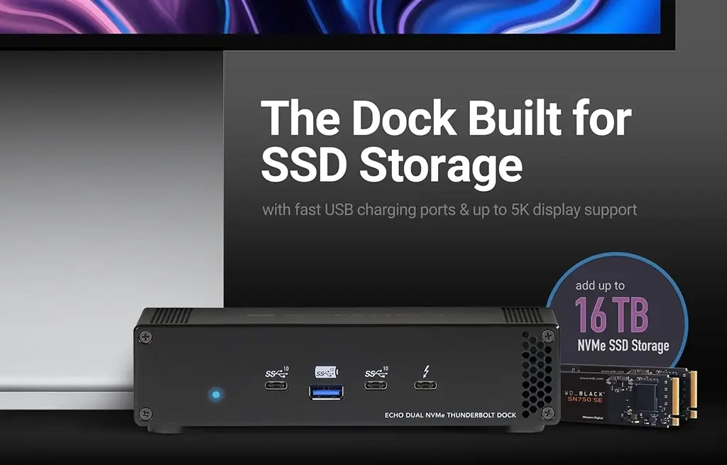 Echo Dual NVMe Thunderbolt Dock features two M.2 NVMe PCIe SSD slots, enabling you to easily install high performance M.2 NVMe SSDs (sold separately) inside. Because installed SSDs interface with the dock’s Thunderbolt controller, they utilize its bandwidth to deliver the performance of a portable Thunderbolt SSD, but are tucked away neatly within the dock.