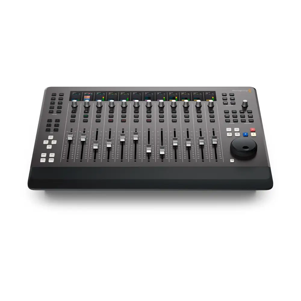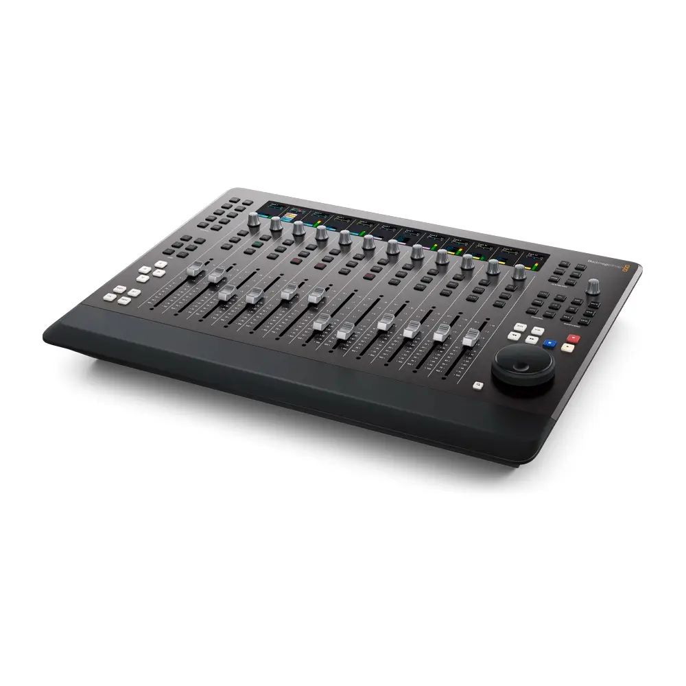 The Fairlight Desktop Console is a complete audio mixing control surface for mixing multiple tracks at once, automating a variety of parameters and plug‑in settings, controlling channel functions, recording, monitoring, and navigating your project. It’s ideal for new users, smaller studios, commercials, online and independent work. You get a familiar mixer design with 12 motorized faders, precision control knobs and illuminated buttons for quickly identifying channels! You can use the knobs and buttons to control channel parameters, EQ, dynamics, plug-ins and more. The built in HDMI output lets you connect a display, giving you the same interactive graphical feedback as the larger consoles!