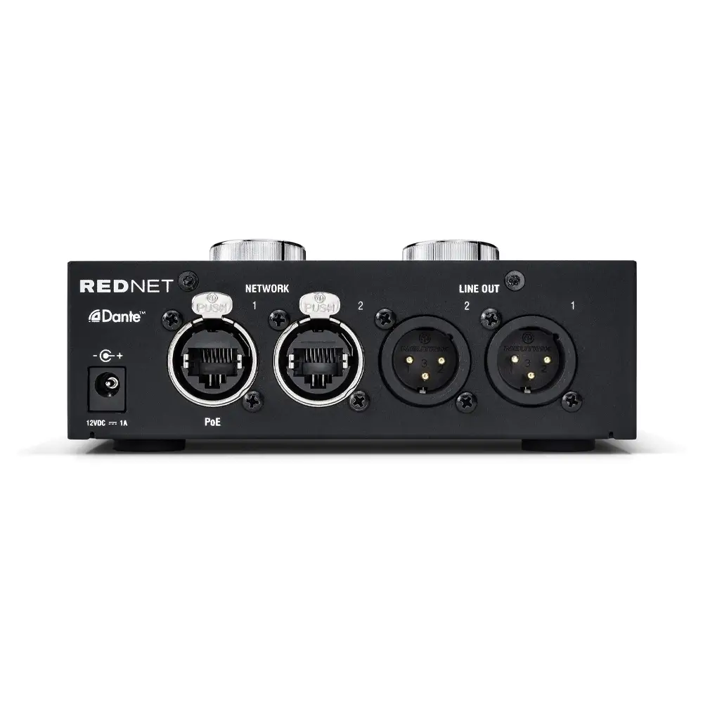 RedNet AM2 is a compact Dante-compatible stereo monitoring unit combining headphone and balanced line outputs for monitoring of signals from the Dante network wherever required. RedNet AM2 features a ¼” front-panel TRS headphone socket plus a pair of rear-mounted balanced line outputs with male XLR connectors for loudspeaker monitoring and other applications. RedNet AM2 can be powered via Power over Ethernet (PoE) or via an external DC power supply (included). RedNet AM2 is ideal for adding headphone outputs to a studio-based system as well as offering a solution for education, live sound and broadcast.