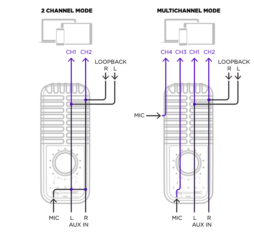 iRig Stream Mic Pro offers 2 modes: stereo or multichannel. By default, it operates in stereo mode and pre-mixes multiple sources of audio – line stereo inputs (+ Loopback) and mic capsules – down to a stereo track, which is sent to your choice of streaming apps like Instagram, Facebook, Twitch, etc.