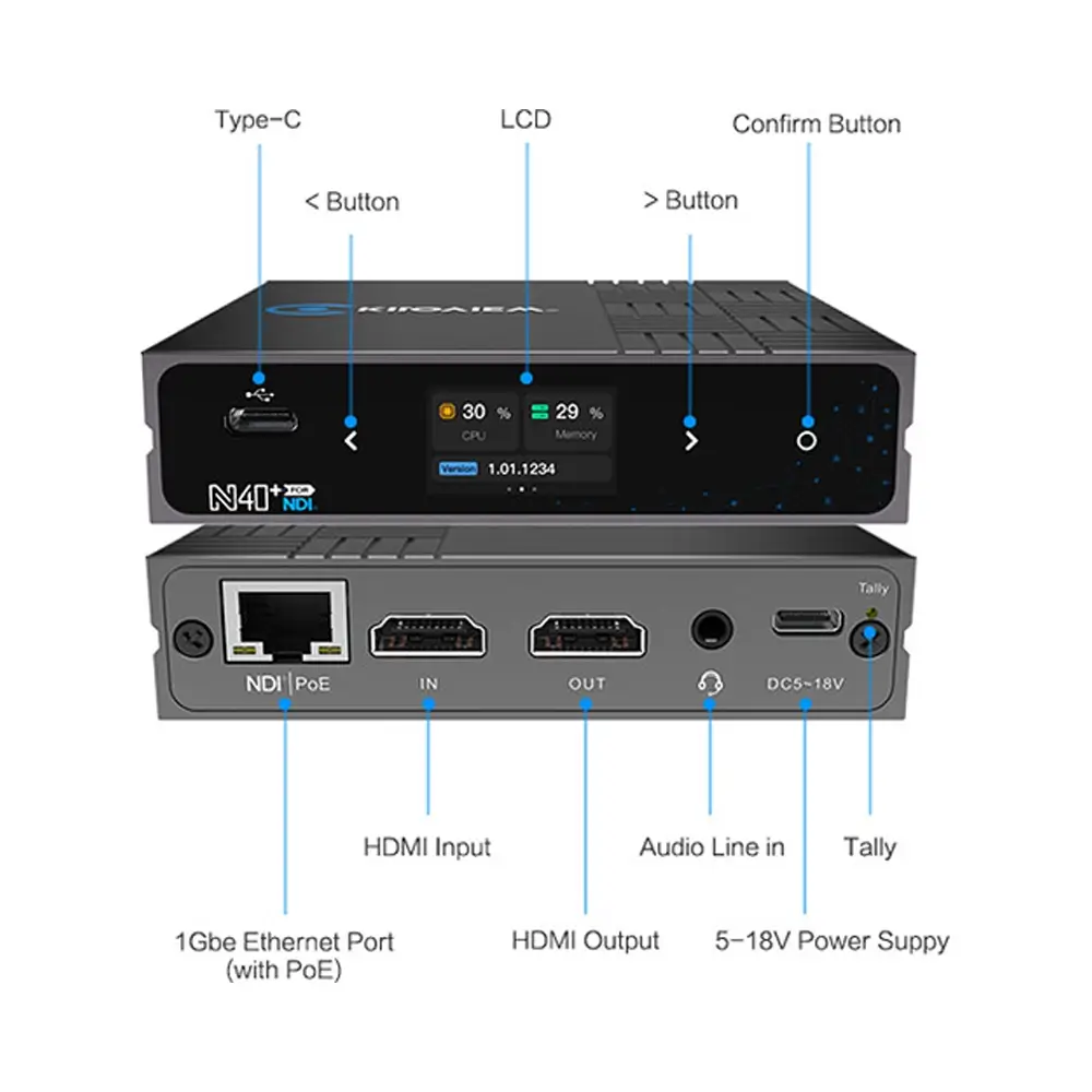 Kiloview N40 Plus is a compact HDMI-to-NDI bi-directional converter purpose-built for handling NDI High Bandwidth video workflows. It supports up to 4Kp60 resolution with HDMI input, output, and loop-through, while remaining fully compatible with lower-resolution sources.