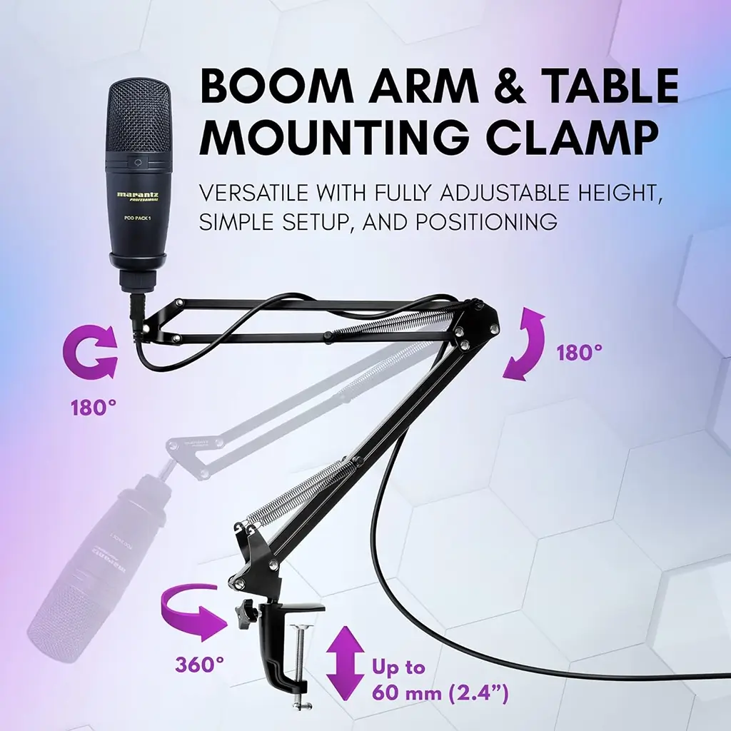 The Pod Pack 1 is a professional upgrade to any announce studio. The kit consists of a high-quality USB condenser microphone paired with a fully-adjustable suspension boom arm, keeping the desk clear and the microphone always in position for podcasting, on-air or voice-over applications. Assembly is a snap and the articulating boom clamps securely to nearly any desk or table surface.