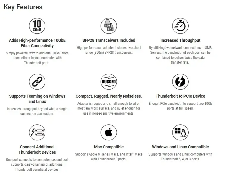 Are you looking for the most economical dual-port approach to connecting to a high-speed 10 Gigabit Ethernet (10GbE) fiber network using the Thunderbolt port on your Mac, Windows, or Linux computer? You’ll need the Sonnet adapter. Sonnet Twin10G™ SFP28 Thunderbolt Adapter is the powerfully simple solution for adding blazing-fast dual-port 10GbE optical network connectivity to your computer.