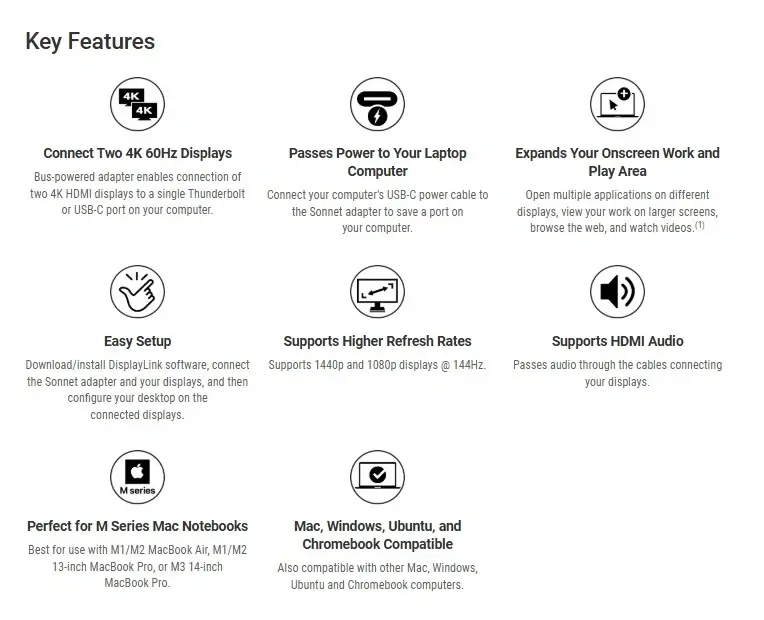 Sonnet USB-C DisplayLink Dual 4K 60Hz HDMI Adapter (with PD Passthrough) is compatible with most computers with USB-C interfaces but was designed for M1/M2 MacBook Air, M1/M2 13-inch MacBook Pro, and M3 14-inch MacBook Pro computers, and other computers incapable of natively supporting more than one external display. If your computer otherwise has Thunderbolt 4 or 3 ports, we recommend Thunderbolt Dual 4K HDMI 2.1 Adapter instead.