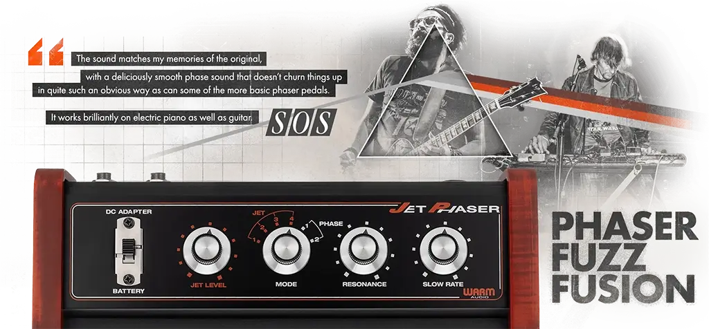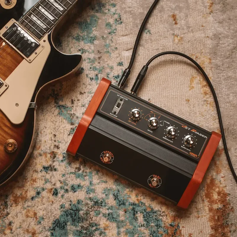The Jet Phaser is a true reproduction of a popular six-mode phase & fuzz pedal made famous in the 1970s. A robust custom metal enclosure with retro wood paneling encases a vintage-correct circuit with premium components throughout. Jet Phaser accurately recreates the tones of the original pedal that were put on the map by legendary musicians including David Gilmour, Eddie Van Halen, The Isely Brothers, Herbie Hancock and many more.