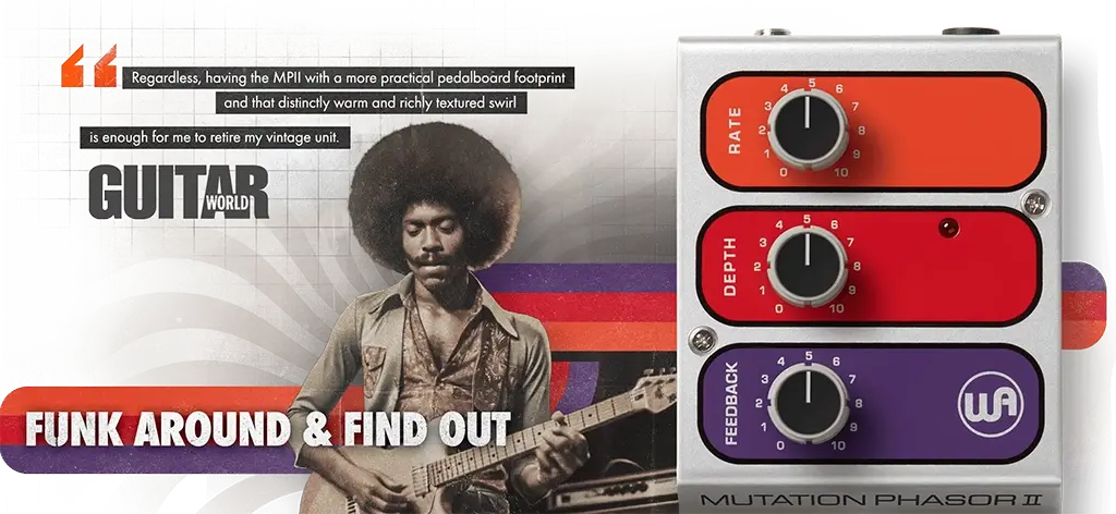 The Mutation Phasor II is an accurate recreation of one of the most desirable,100% analog phaser circuits made famous in the experimental era of the 1970s. Mutation Phasor II has all of the vintage vibes of the original phaser pedal allowing you to add depth, wobble, swirl, or “instant funk” to guitar, keys, bass, or anything you can dream of. This electro-optical phase-shifting pedal is built with a true-to-spec recreation of the 70s circuit using premium components. True to the original pedal, Mutation Phasor II delivers all the rich depth and instant psychedelic tones, favored by innovative musicians and producers like Billy Corgan, Tom Bukovac, Robin Trower, and many more.