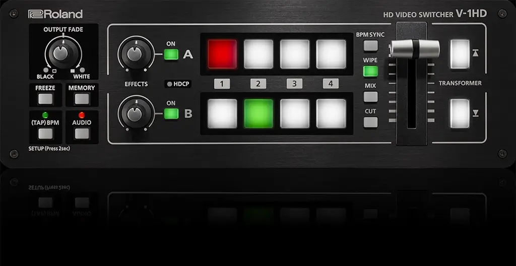 The V-1HD makes your job easier with two technology-assisted automatic switching modes. Input Scan switches sources in a range of 1–120 seconds in sequence. Beats Per Minute (BPM) Sync is also available, automatically switching Preview and Program at a specified song tempo.