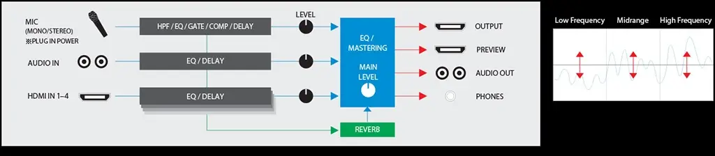 The V-1HD might be small, but its powerful 12-channel digital audio mixer fits effortlessly into any live production environment. Mix embedded audio from all four HDMI channels with a stereo line-level or mic level input. Each audio input channel features delay, EQ, reverb, and mastering effects on all outputs, including both HDMIs and stereo RCA connection. Therefore, the V-1HD replaces many standalone sound processing racks.Mastering function adjusts the sound balance of each frequency band.