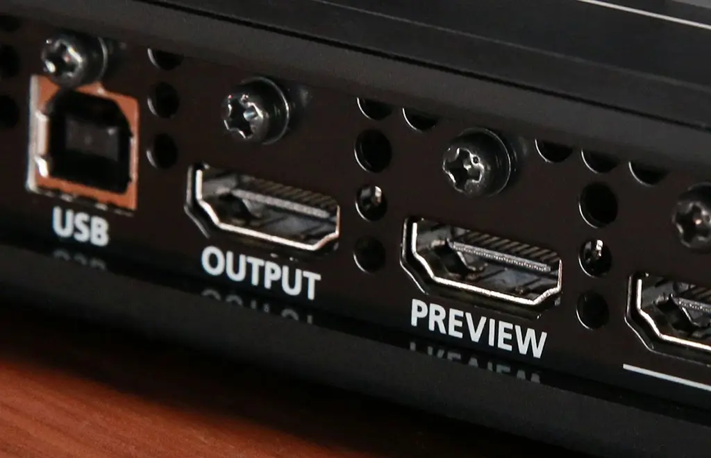 Two independent HDMI outputs are available. One output can be assigned to display one of three different video busses, providing the versatility needed for professional production. For example, use one as the main program output for a projector/monitor, recorder, or livestream. The second output may be used to split the main program output, turn any HD video monitor into an “up-next” input preview display, or show a four-way multi-viewer preview screen.
