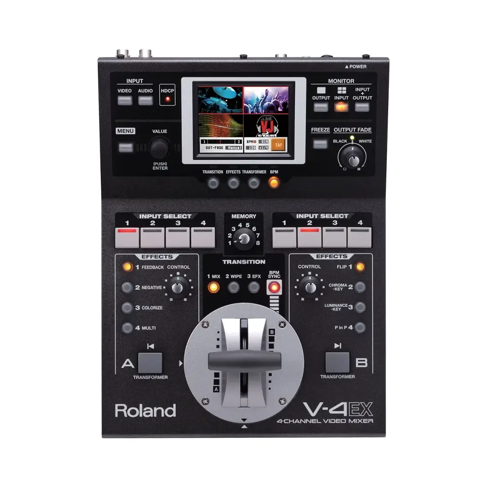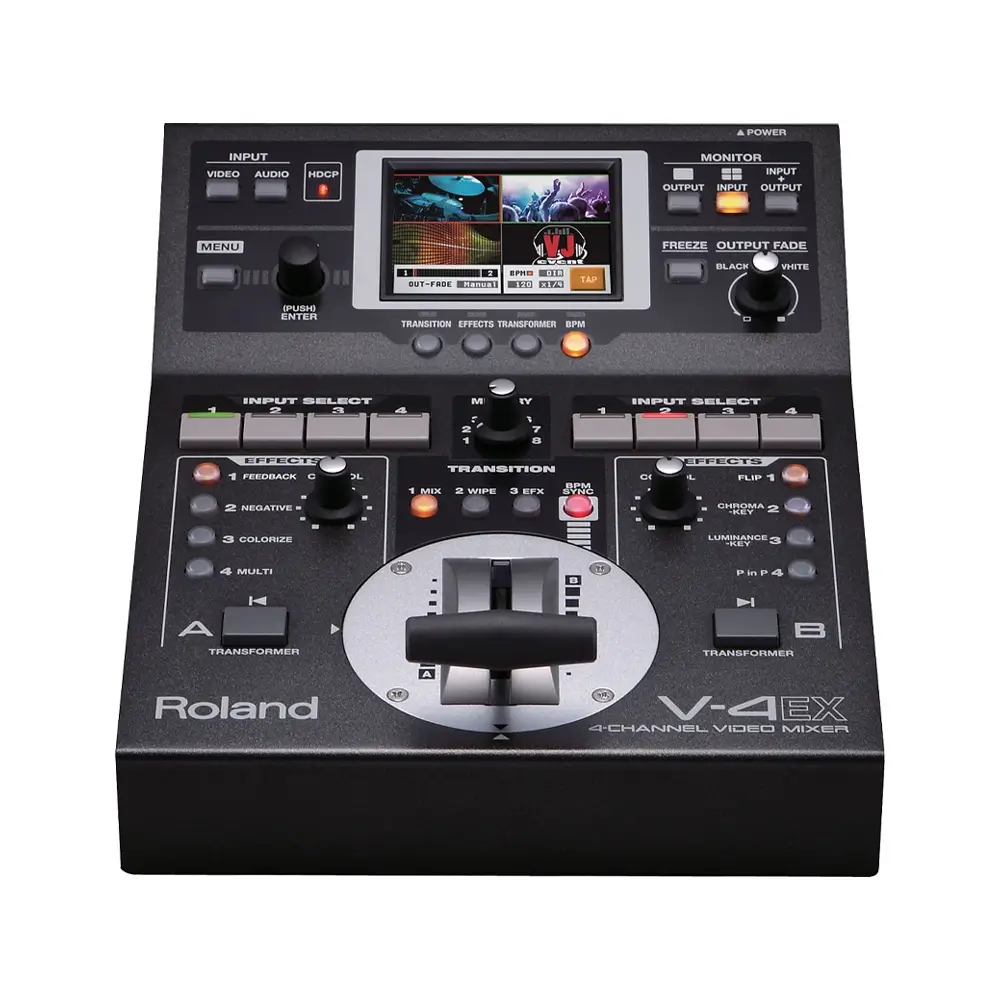 The Roland V-4EX Four Channel Digital Video Mixer with Effects is a live production switcher and web streaming device that improves on the Roland V-4 Video Mixer by adding a built-in multiviewer with touch control screen and HDMI in/out, with 1080p/RGB WUXGA (1920 x 1200) support on one input, and 1080p output. You can switch between four video sources and deliver via HDMI, RGB Component, composite video, and stream via the built-in USB port. Four built-in frame synchronizers, one per input, allow you to support and cleanly switch input video from sources that are not gen-locked. This unit is well suited for clubs, concerts, worship, events, weddings, education, and sporting events.