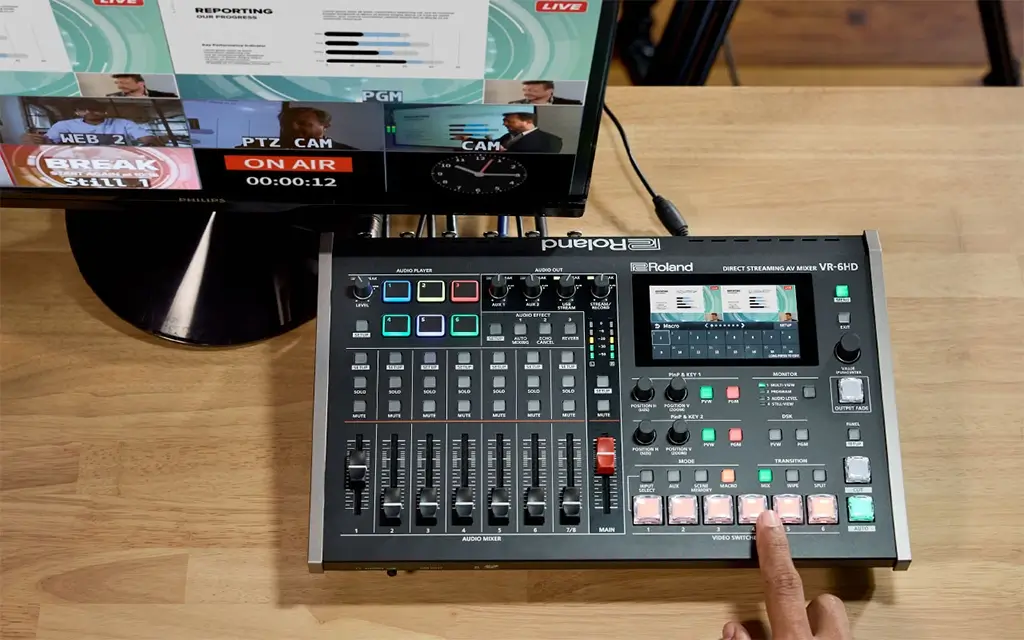 Thanks to its well-organized panel and intuitive workflow, even novice operators will feel comfortable using the VR-6HD. Hardware knobs, faders, and buttons offer direct control for essential functions, while the 4.3″ touch display provides smooth access to deeper parameters and settings. Scene memory, macro, and sequencing features simplify operation even more, letting you preprogram complicated actions and fire them off with simple actions.