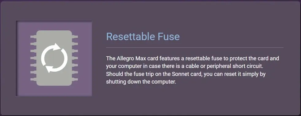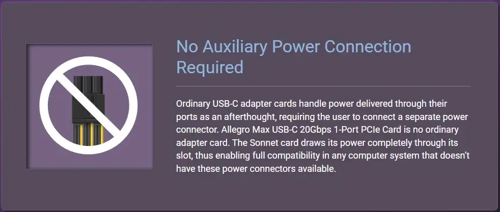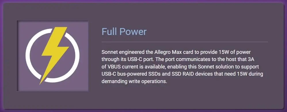 Sonnet designed Allegro Max card with a custom USB-C connector that locates the port near the center of the PCIe bracket. Unlike other cards that use standard Type-C connectors that are mounted close to the edge of the bracket, this Allegro card provides plenty of clearance for you to plug in and fully seat cables.