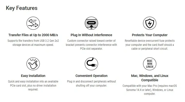Your computer’s USB ports are perfectly adequate…for connecting peripherals that don’t depend on the ultimate USB 3.2 speeds. Onboard USB ports can be underachievers — at 5Gbps or 10Gbps, they can’t support the maximum performance of USB 3.2 Gen 2×2 storage devices — up to 2000 MB/s — and may not provide enough power to enable them to operate. With Sonnet Allegro™ Max USB-C 20Gbps 1-Port PCIe Cardinstalled into a PCIe® card slot of your Mac Pro® (requires macOS® Sonoma 14.4 or later), Windows or Linux computer, you can upgrade to the benefits of SuperSpeed 20Gbps USB-C®!