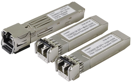 With Solo10G SFP+ adapter, Sonnet includes an interchangeable short-range multi-mode fiber optical SFP+ module (up to 300 meters), part number G10E-SFP-SR. Sonnet also offers the following SFP+ transceiver modules, sold separately: a long-range single-mode fiber optical module (up to 10 kilometers), part number G10E-SFP-LR; and a 10GBASE-T copper module (up to 30 meters using Cat 6A cables), part number G10E-SFP-T. Alternatively, you can use cost-effective direct-attach Twinax copper cables (up to 10 meters long).