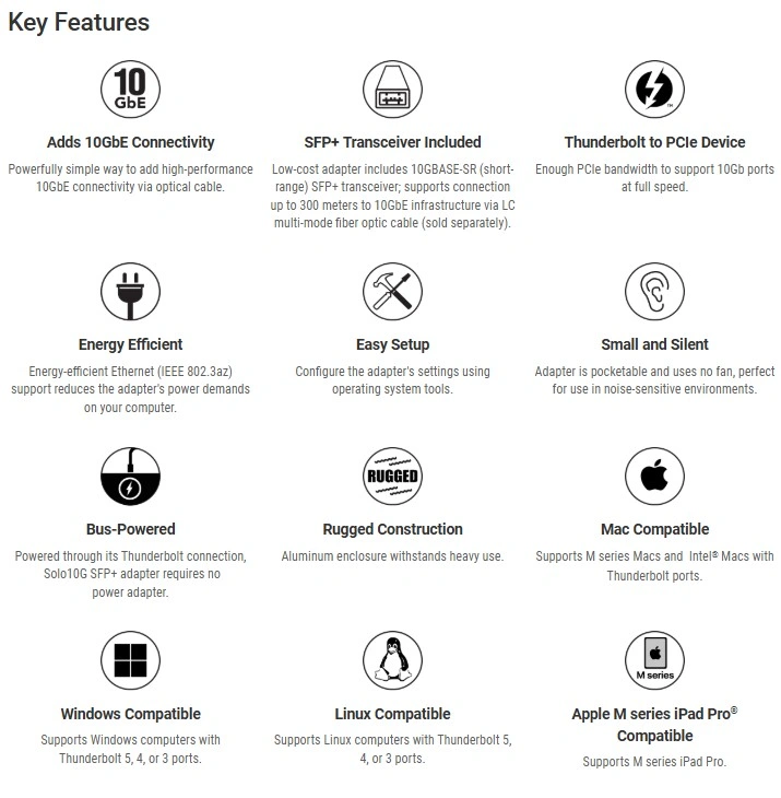 Most post-production shared storage workgroups and other bandwidth-intensive workflows have been rapidly transitioning to 10Gb Ethernet as the new data transfer standard. For many, the 10Gb Ethernet network infrastructure of choice is optical (SFP+) 10Gb Ethernet. For these workgroups, there is now an affordable 10GbE interface for your Mac, Windows, or Linux computer with Thunderbolt™ ports — Solo10G™ SFP+ Thunderbolt Adapter, a powerfully simple solution for adding blazing-fast fiber optic 10GbE network connectivity.