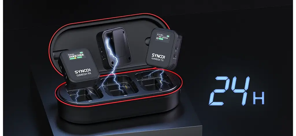 The SYNCO G2 Mega can capture sounds for up to 24 hours in total. Its built-in rechargeable Li-ion battery allows it to function continuously for 8 hours. The supplied charging box provides two additional charges, thus ensuring 24-hour recording in total. This makes the G2 Mega an ideal option for a variety of applications such as live streaming, TV shows, mobile interviews, vlogs, and more.