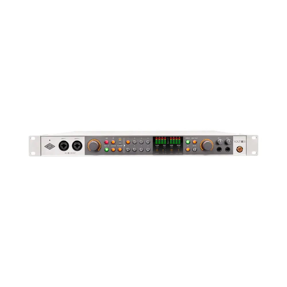Universal Audio Volt 876 gives you 8 x 8 analog connections for mics, instruments, and studio gear, plus two front-panel mic/line inputs with switchable Hi-Z for easy DI recording.