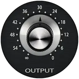 The output control adjusts the amount of makeup gain applied to the output signal. This is on a numerical scale showing 54 dB to 0 dB. Turning the knob clockwise adds makeup gain. Take care to monitor DAW or recording device input levels as you raise the makeup gain to avoid unwanted clipping.